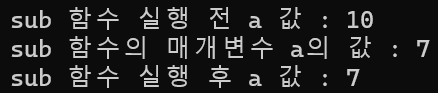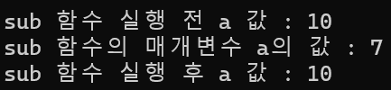출력 결과에서 알 수 있다시피, 메인 함수에서 선언하고 할당한 a의 값은 sub함수를 실행하기 전이나 후나 바뀌지 않는다.