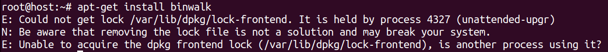 E: Could not get lock /var/lib/dpkg/lock-frontend. It is held by process 4327 (unattended-upgr)