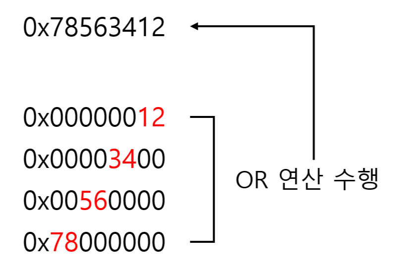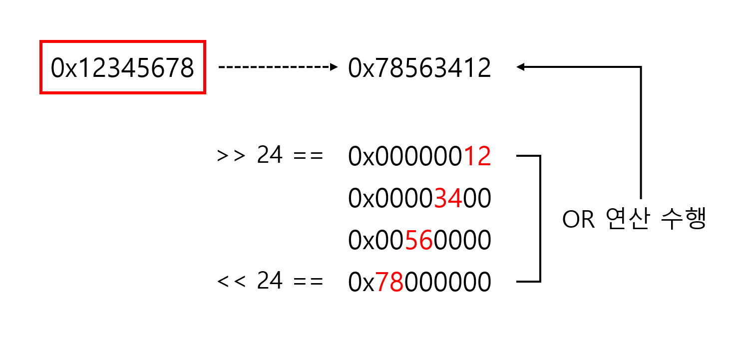 ์ผ์ชฝ์ ๋ณด์ด๋ 0x12345678 ์ด๋ผ๋ ๋ฐ์ดํฐ๋ฅผ 0x78563412๋ก ๋ฐ๊พธ์ด์ผ ํ๋ค.