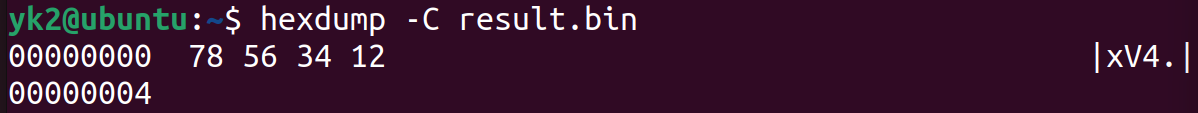 hexdump๋ก result.bin ํ์ผ์ ํ์ธํด๋ณด๋ฉด ๋น ์๋์ธ์์ ๋ฆฌํ ์๋์ธ์ผ๋ก ๋ณํ๋์ด ์ ์ฅ์ด ๋ ๊ฒ์ ๋ณผ ์ ์๋ค.