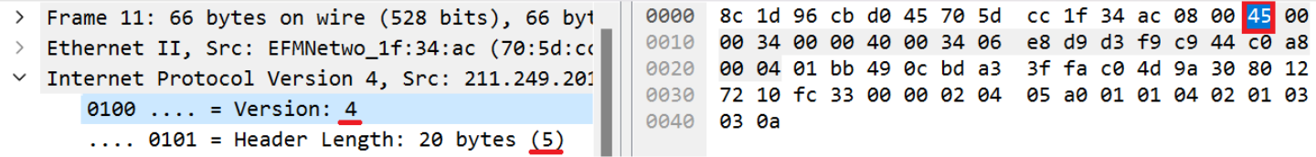 ๋น ์๋์ธ ์์ ๋๋ฌธ์ 5 โ 4 ์์๋ก ๊ฐ์ด ๋ค์ด๊ฐ๋ฏ๋ก Header Length(IHL)์ ๋จผ์ ๊ฐ์ ๋ฃ์ด ์ฃผ์๋ค.