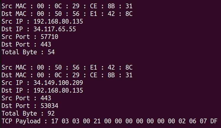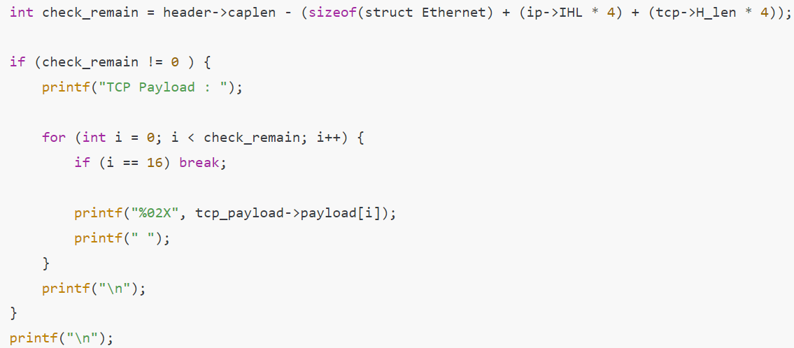 - struct TCP_Payload : TCP ํ์ด๋ก๋๋ฅผ ์ ์ฅํ ๊ตฌ์กฐ์ฒด