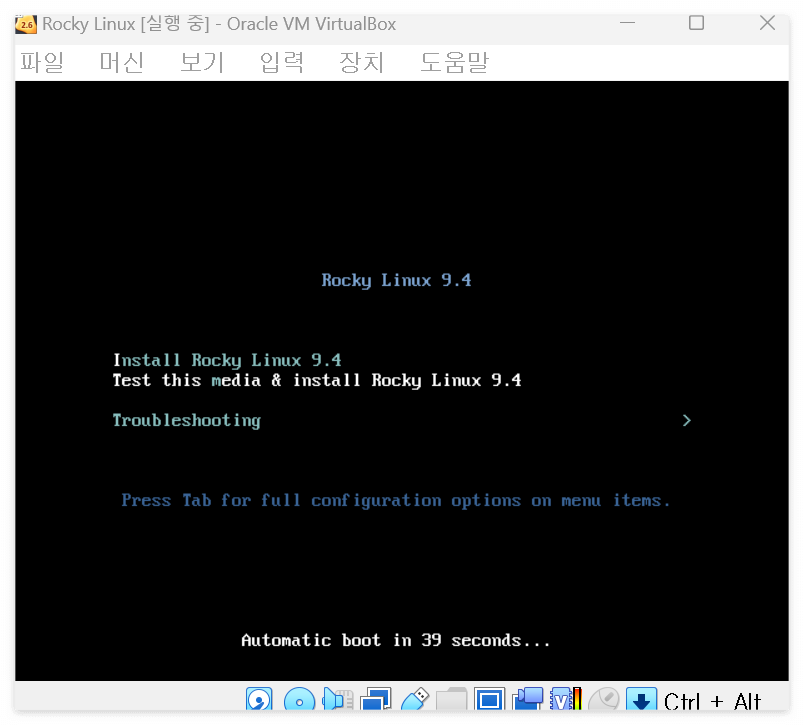 가상 머신을 실행하면, 부팅되는 화면이 보여진 후, 다음 화면이 보여짐