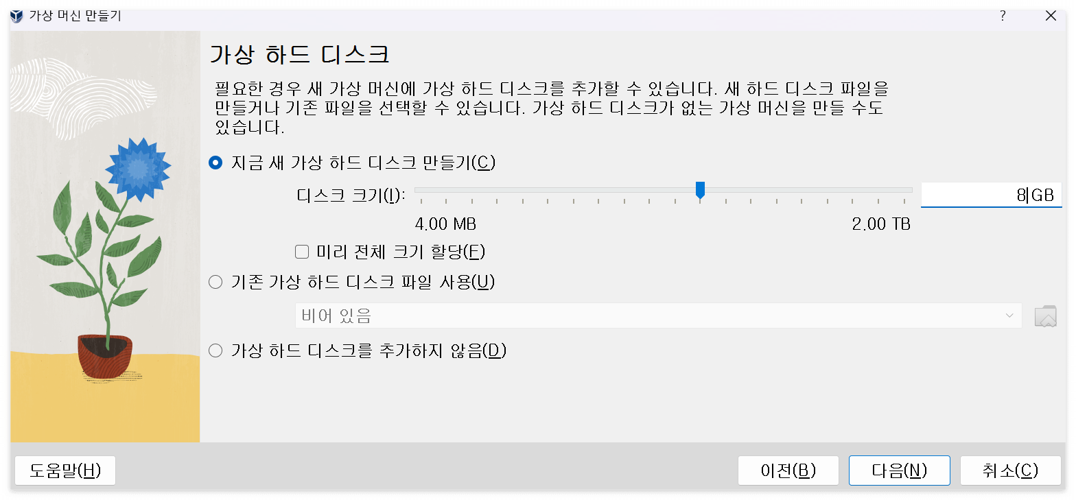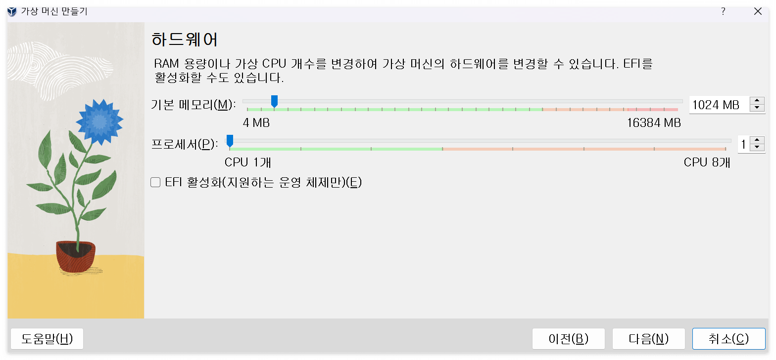 RAM 용량이나 가상 CPU 개수를 설정해 준다. (임의 설정)