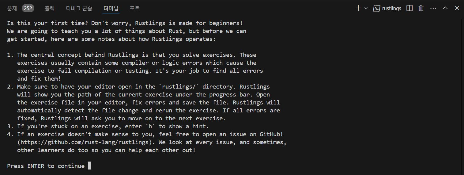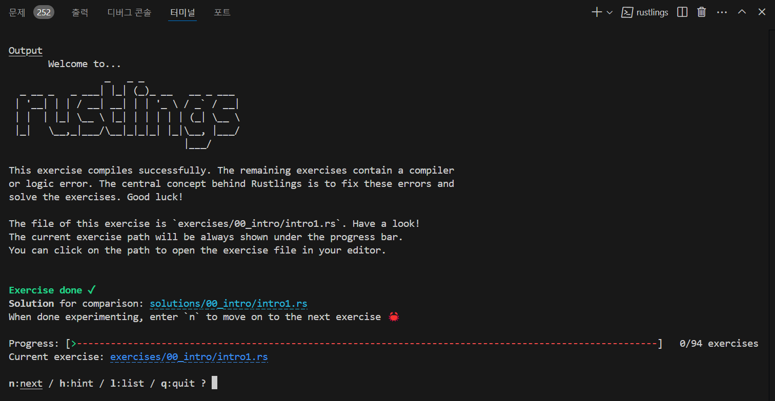 - Rustlings는 파일 변경 사항을 자동으로 감지하고 문제를 다시 실행할 것입니다.